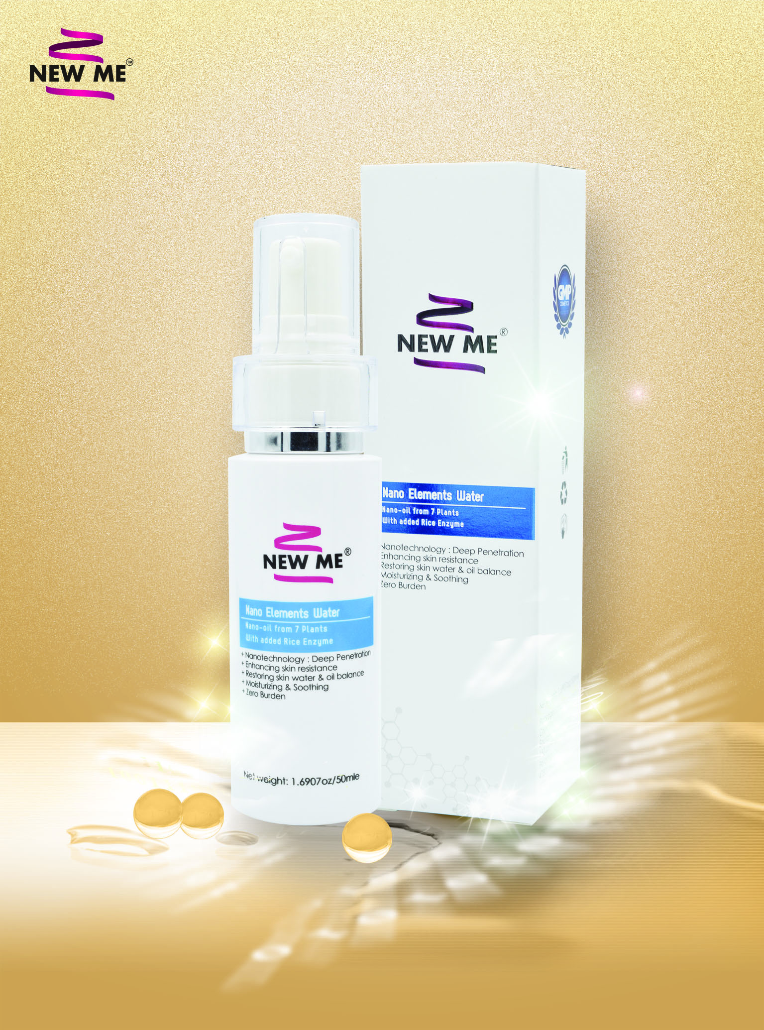 New Me Nano Elements Water 纳米原肌水: 7种植物油脂和维生素E,分子粒径100纳米左右,可以形成纳米乳化效果,具有多种植物的活性功效,易于吸收,维持肌肤水油平衡,滋养润肤。